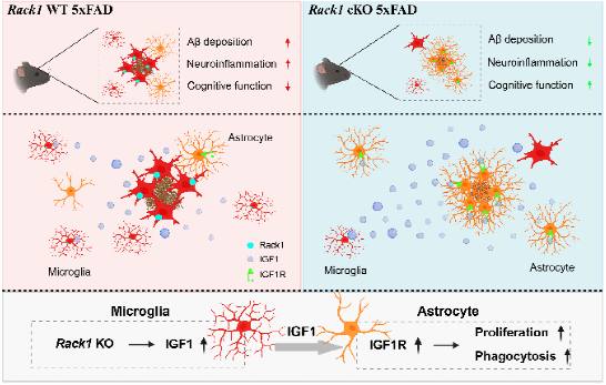 本研究发现了小胶质细胞Rack1缺失通过增强IGF1介导的星形胶质细胞吞噬作用,减少了AD模型小鼠中Aβ沉积和神经炎症,改善了AD模型小鼠的认知障碍,为小胶质细胞-星形胶质细胞互作提供了新见解,也为AD的治疗提供了新的干预靶点和新策略(图7)。