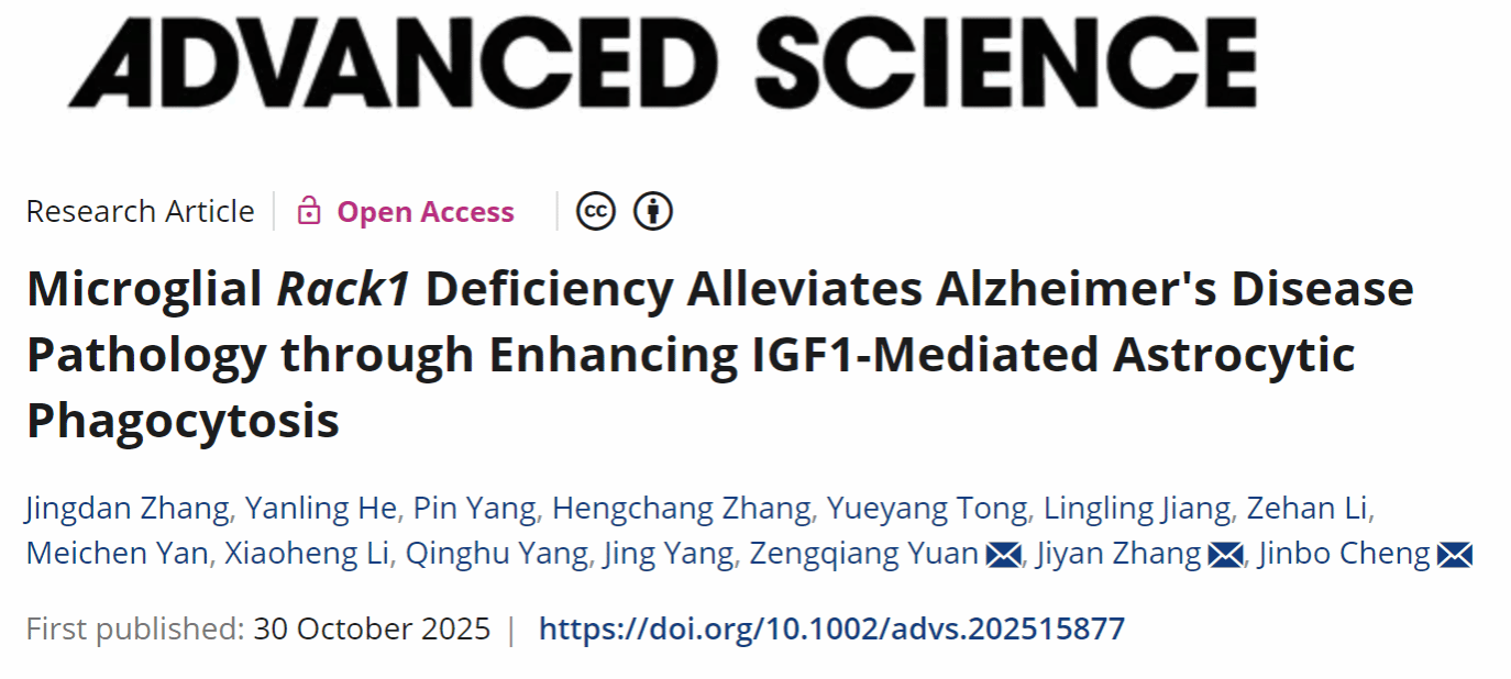 2025年10月30日,程金波教授在阿尔茨海默病致病机制方面取得重要进展,研究成果以“Microglial Rack1 Deficiency Alleviates Alzheimer’s Disease Pathology through Enhancing IGF1-Mediated Astrocytic Phagocytosis”为题发表在国际顶级期刊Advanced Science(中国科AG娱乐城