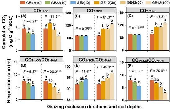 研究结果发现,土壤微生物对外源碳的输入反应迅速,由土壤有机碳和碳氮比控制的微生物生物量是直接影响微生物对外源碳输入反应强度的最重要因素。放牧和较深的土壤层减少了来自外源碳的呼吸作用及其对总呼吸作用的相对贡献(图1),主要归因于土壤碳氮比和真菌/细菌的变化。此外,外源碳添加促进了所有土壤中有机质的分解,使土壤有机质的呼吸作用增加了11.3–92.4 mg C g-1 SOC,相当于18.7–266.1%的激发效应。放牧和土壤深度增加导致了更大的激发效应和土壤碳损失,其中土壤碳氮比和有机碳含量是最重要的调节因素。