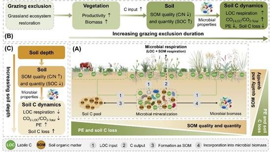 图2 禁牧和土壤深度变化对外源碳输入下草原土壤微生物呼吸和土壤碳动态影响的概念图
