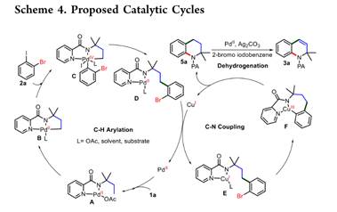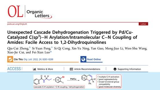 罗斐贤研究组利用前期发展的碳氢键活化启动的串联反应策略(Org. Lett. 2019, 21, 1668.),探索Pd/Cu协同催化生物质醇小分子衍生制备的酰胺合成高价值四氢喹啉化合物,意外发现了串联中性碳氢键脱氢反应得到具有重要应用价值的1,2−二氢喹啉分子骨架。通过机理研究证实,该反应首先经历Pd催化分子间碳氢键芳基化反应,接下来Cu催化串联分子内碳氮键偶联和后续Pd催化四氢喹啉β,γ−脱氢反应得到1,2−二氢喹啉化合物,实现了三步反应一锅法高效有序转化。此外,脱氢反应步骤中Ag2CO3和卤代烃都至关重要。该研究为烷烃脱氢制备高价值烯烃提供了一种全新策略,具有重要的理论价值和潜在应用价值。相关研究成果以Unexpected Cascade Dehydrogenation Triggered by Pd/Cu−Catalyzed C(sp3)−H Arylation/Intramolecular C−N Coupling of Amides: Facile Access to 1,2−Dihydroquinolines为题在《Organic Letters》(化学1区,有机化学TOP期刊,IF=6.072 (Nature Index收录),Org. Lett. 2022, 24, 8283.)上发表。