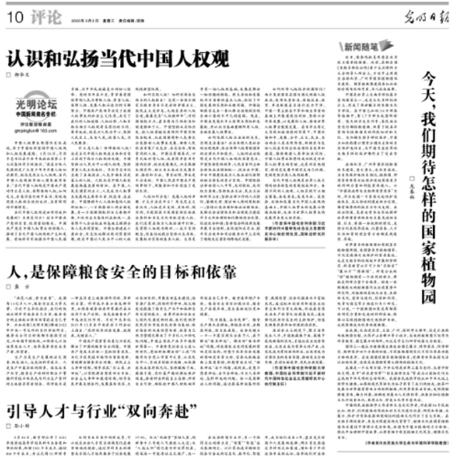 2022年3月2日,《光明日报》第10版发表了龙春林教授撰写的文章,这篇以“今天, 我们期待怎样的国家植物园?”为题的新闻随笔,分析了“植物文化”在国家植物园体系建设中的重要作用。“神农尝百草”“制耒耜种五谷”等是我国早期农业文明的生动写照,祖先们将狗尾巴草驯化为养育中华民族的谷子,把茶叶培育为“影响世界的中国树叶”,水稻的驯化和新品种培育更是中国利用生物多样性为世界做出的巨大贡献。傣族、独龙族等保护和利用野生食用植物的传统知识,苗族、瑶族等采集药用植物防病治病的民间医药知识,都是我国博大精深的植物文化,值得在国家植物园中展示,彰显中国植物文化的巨大生命力。