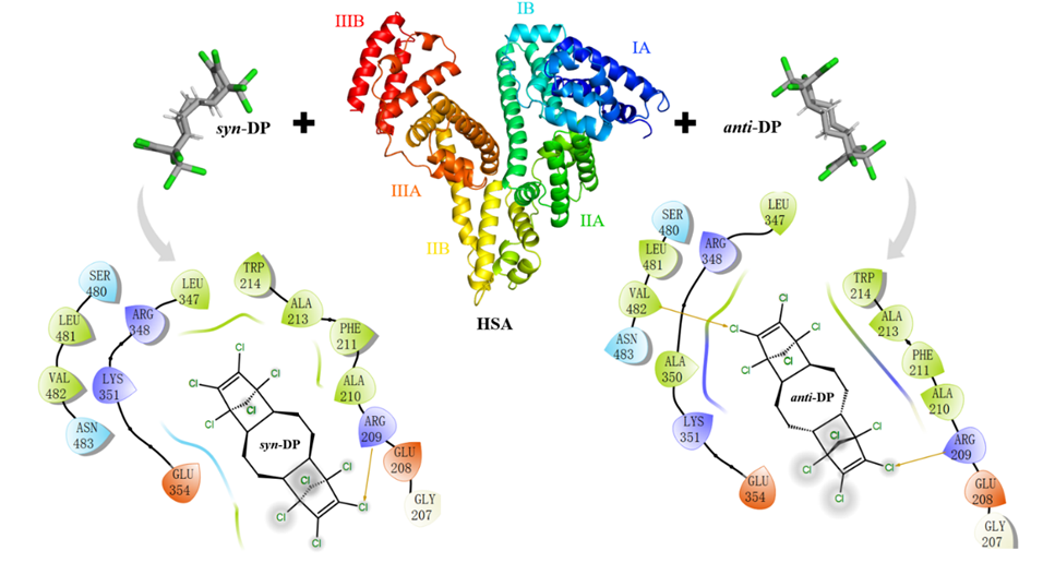 得克隆(Dechlorane Plus,DP)是一种高度氯化的阻燃剂,价格便宜、密度低,并且在热和光化学方面非常稳定。《斯德哥尔摩公约》对灭蚁灵和多溴联苯醚(PBDEs)的使用和生产进行监管导致其替代品DP的使用量从2007年开始增加,我国是目前生产和消费DP最多的国家之一。DP目前已在世界范围内广泛的环境介质包括人体内检出,但是目前对于DP在人体内的转运及代谢等行为还不清楚。该研究采集了我国江苏省无锡市普通人群连续五年的血清样本(2012年至2016年),首次分析了我国普通人群血清中DP浓度的时间变化趋势,并总结了以往研究中DP同分异构体在人体组织中的分布,发现暴露水平以及组织成分是影响DP分布的重要原因。人血清白蛋白(Human Serum Albumin,HSA)是人血清中重要的转运蛋白,主要负责转运人血中的脂肪、药物和污染物,是血清组织的重要成分。该研究通过实验确定了DP在HSA上的结合位点(亚域ⅡA和ⅡB之间的界面)(图1),并计算了两种DP与HSA的亲和力,对于理解污染物在体内的转运及代谢行为具有重要意义。