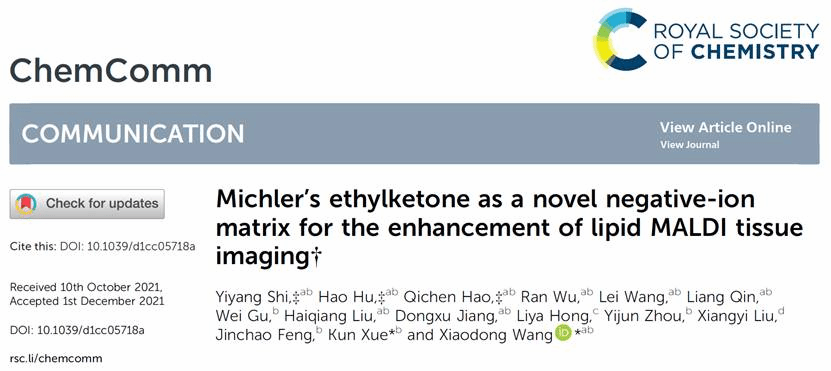 (质谱成像与代谢组学国家民委重点实验室)王晓东教授团队继成功筛选出适用于动、植物组织样本表面多种内源性小分子化合物原位表征新型基质(DMCA)(Analytical Chemistry, 2019, 91(4), 2634-2643,SCI一区)、DCH(Chemical Communications, 2019, 55(83), 12559-12562,SCI一区)后,在MALDI源质谱脂质成像新型基质研究领域又取得了重要进展,相关研究成果以“Michler's ethylketoneas a novel negative-ion matrix for the enhancement of lipid MALDI tissue imaging”为题,发表在分析化学综合顶级期刊《Chemical Communications》(Nature Index收录)上,该研究论文同时被遴选为期刊封面文章(Front Cover)。该研究成果是王晓东教授团队2021年度在分析化学顶级期刊《Analytical Chemistry》(2021, 93(35), 11920-11928, Front Cover)、《Chemical Communications》(2021, 57(82), 10707-10710, Back Cover)连续发表封面文章后再次入选顶级期刊封面文章(Front Cover),中央民族大学皆为该系列论文的第一作者单位及唯一通讯单位。