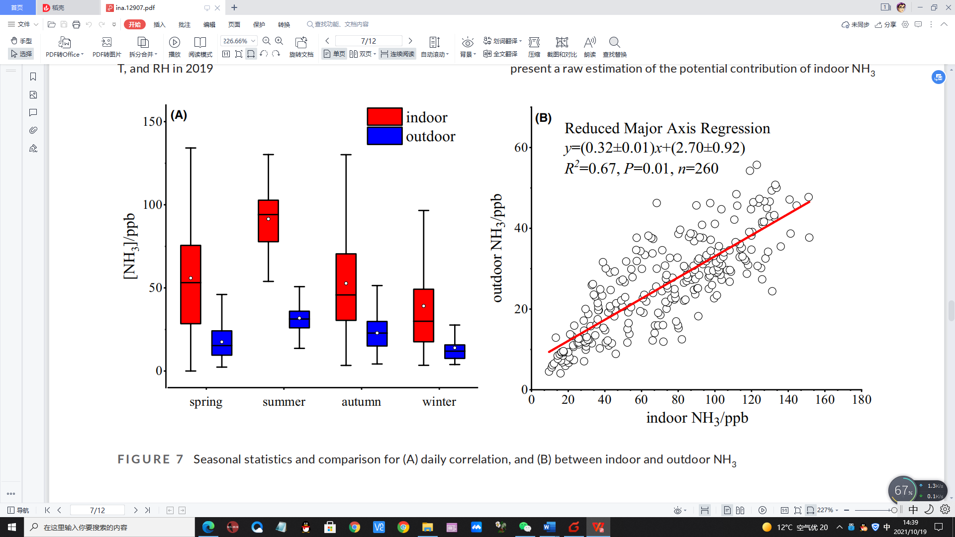 FIGURE Seasonal statistics and comparison for (A) daily correlation, and (B) between indoor and outdoor NH3