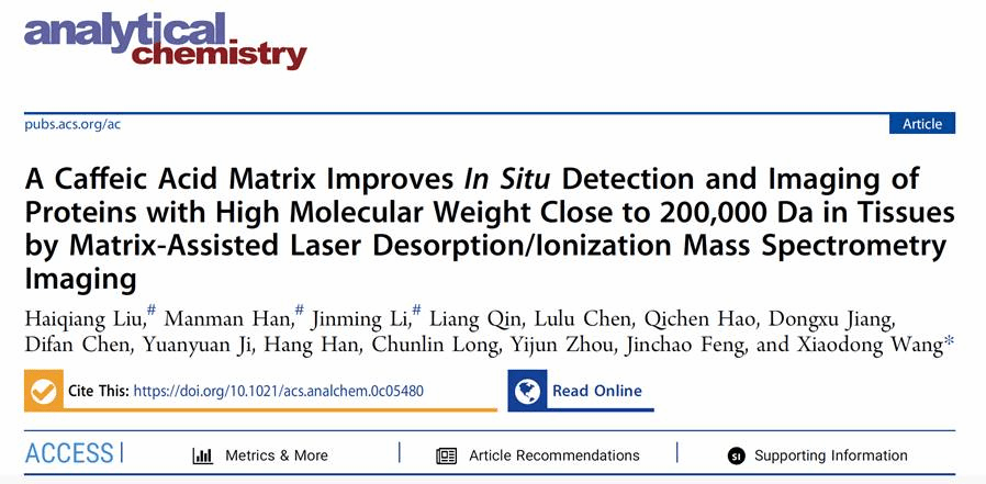 (质谱成像与代谢组学国家民委重点实验室)王晓东教授团队在MALDI-MSI蛋白质原位检测及成像表征新型基质研究领域取得了又一重要进展。相关研究成果以“A Caffeic Acid Matrix Improves In Situ Detection and Imaging of Proteins with High Molecular Weight Close to 200,000 Da in Tissues by Matrix-Assisted Laser Desorption/Ionization Mass Spectrometry Imaging”为题,发表在分析化学顶级期刊《。