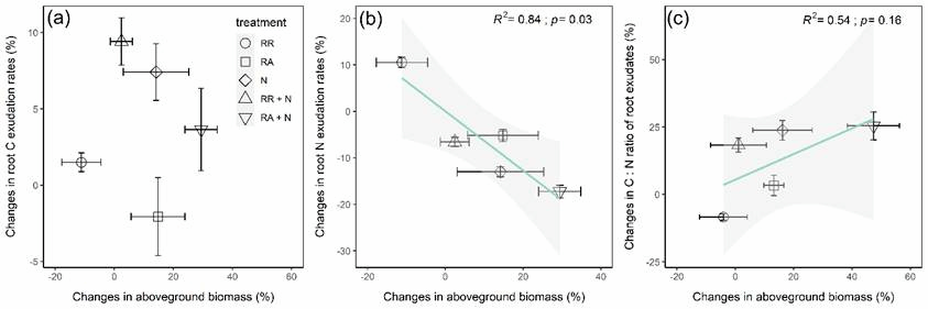 图3植物地上生物量的变化与根部C、N分泌速率以及根部渗出物的C:N比率变化之间的关系