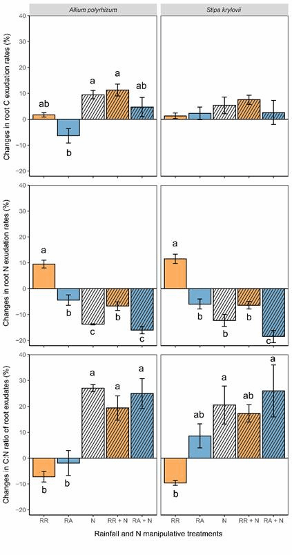 人类活动(如化石燃料燃烧和农业施肥等)导致了全球氮沉降的增加。据相关研究预测,全球降水模式将在未来发生变化——亚热带和中纬度地区的降水将减少,而热带和高纬度地区的降水将增加。氮沉降和降水模式的同步变化会对植物生长和地下碳分配产生复杂的交互影响,改变植物–土壤–微生物的相互作用,并导致碳氮循环过程的变化,从而对生态系统功能产生重大影响。根系分泌物可以通过影响土壤的碳输入来调节土壤微生物的活动,进而影响土壤有机碳的形成和稳定,这在未来全球气候变化的背景下尤为重要。然而,目前关于氮沉降和降水模式的改变对植物根系分泌物的碳、氮分泌速率以及C : N化学计量比率的影响仍不清楚。