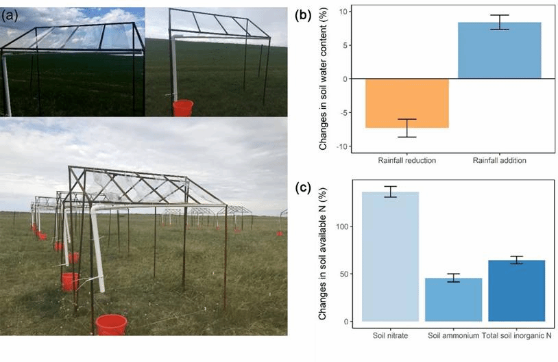 图1 (a)表示实验设计的实体布局图;(b)表示降雨减少和增加处理所导致的土壤含水量(%)的变化;(c)图表示氮添加处理导致土壤可利用氮含量的变化