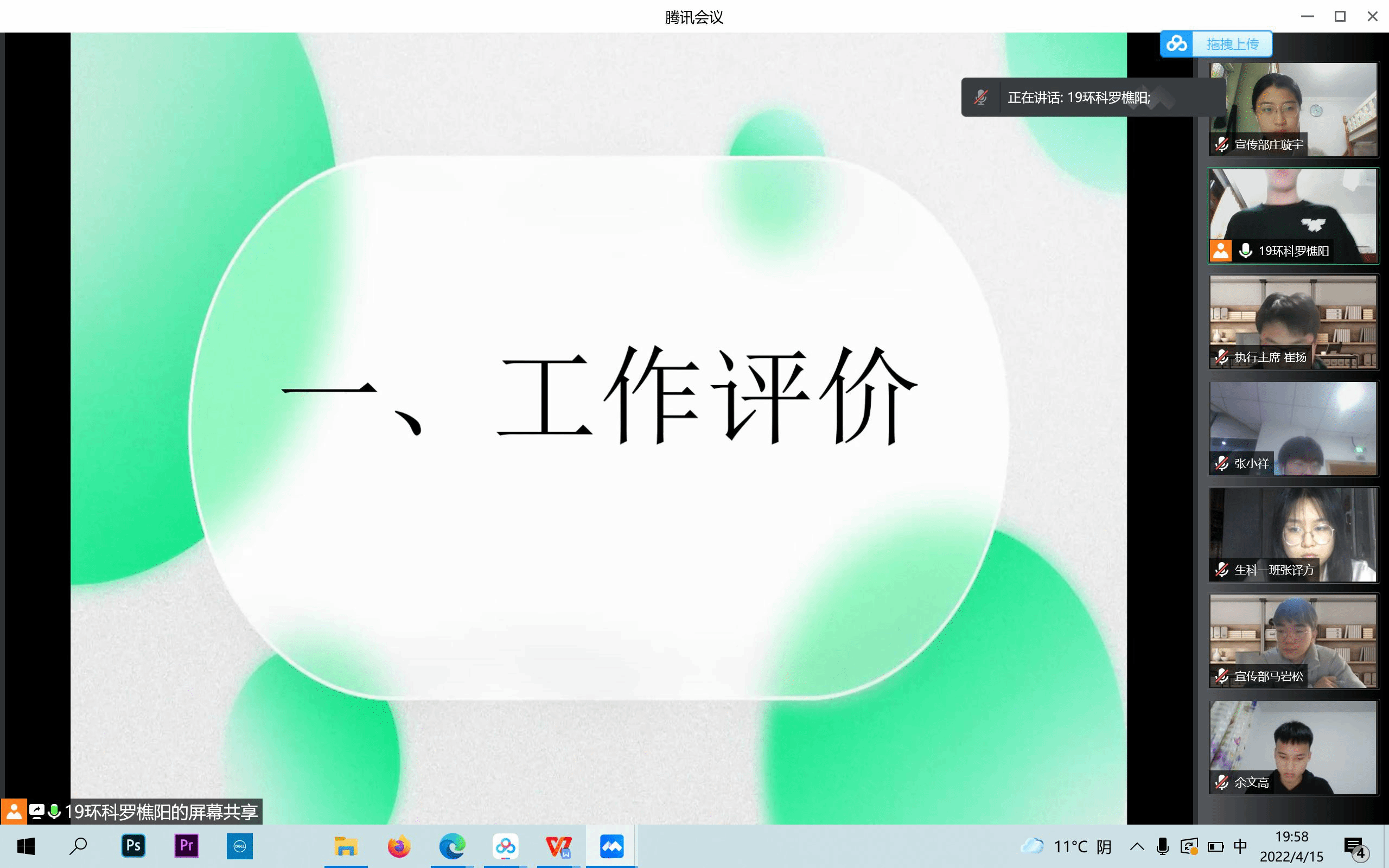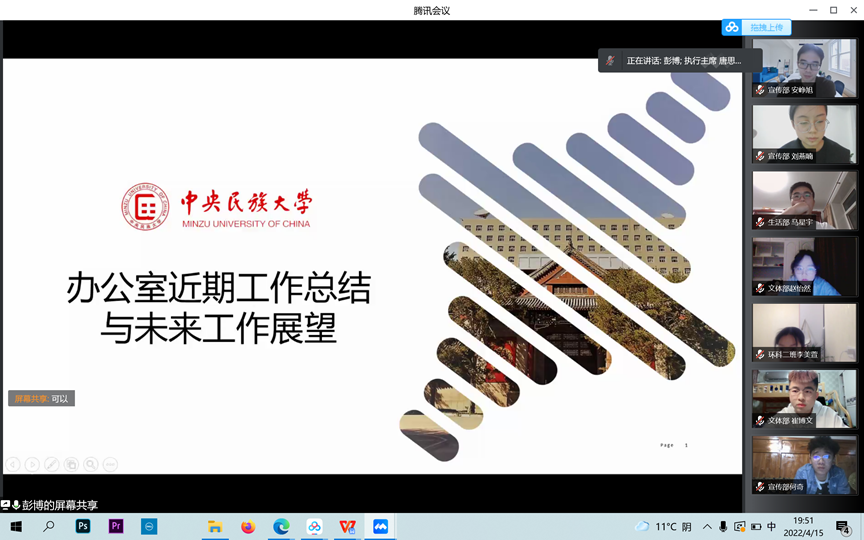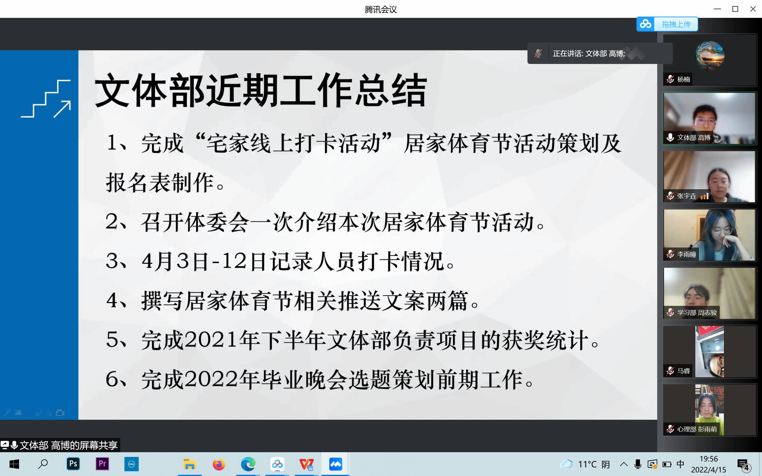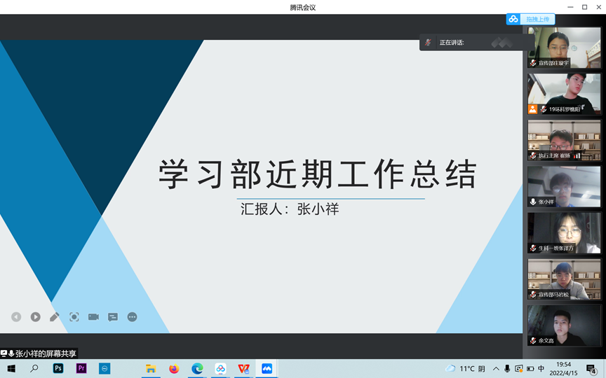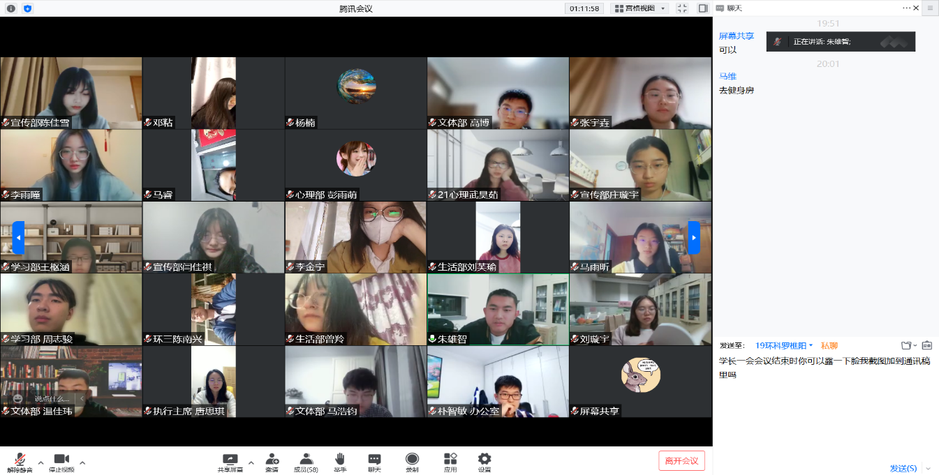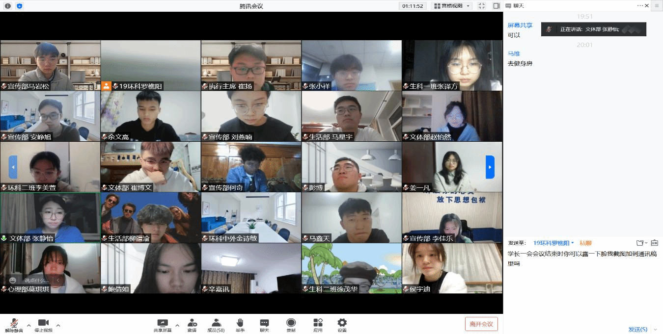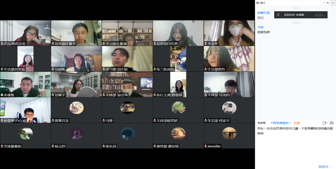 执行主席崔扬发言。他肯定了各部门近期居家工作的成果,希望各成员做好消息的上传下达,完成好工作衔接。此外,他指出同学们居家学习可能会有所懈怠,希望同学们端正学习态度,并且各部门要发挥出引导作用以更好地帮助大家完成居家学习。