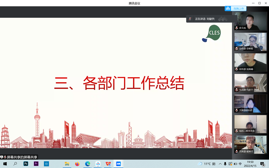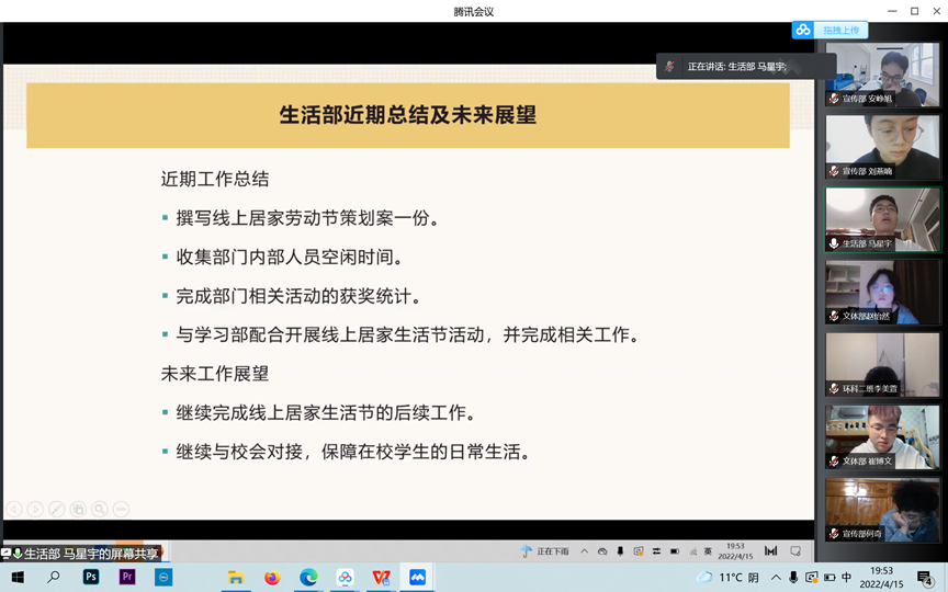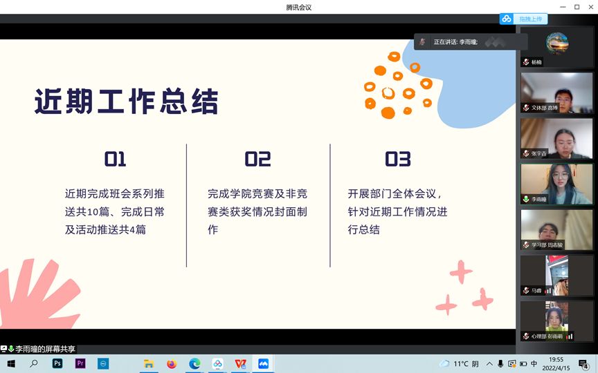 会议伊始,刘璇宇老师对近期学生会工作进行总结,并对今后工作提出规划安排。首先,刘璇宇老师对各部门的整体工作表示肯定,她希望各成员砥砺前行,用昂扬的工作态度来办好即将到来的各项活动及日常事宜。此外,她希望学生会成员能够以身作则,引导气氛,维持同学们乐观向上的居家学习状态。最后,她希望同学们能够健康、安全地居家生活,并期待与大家再次相聚。