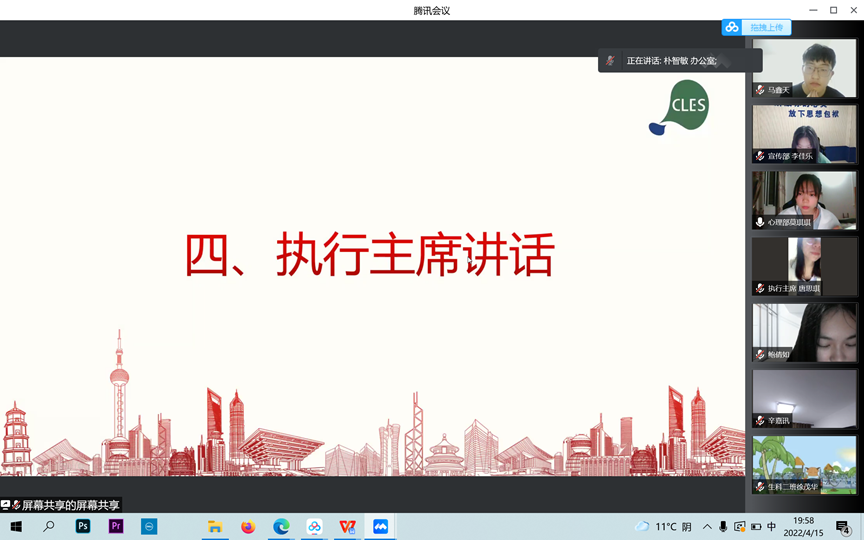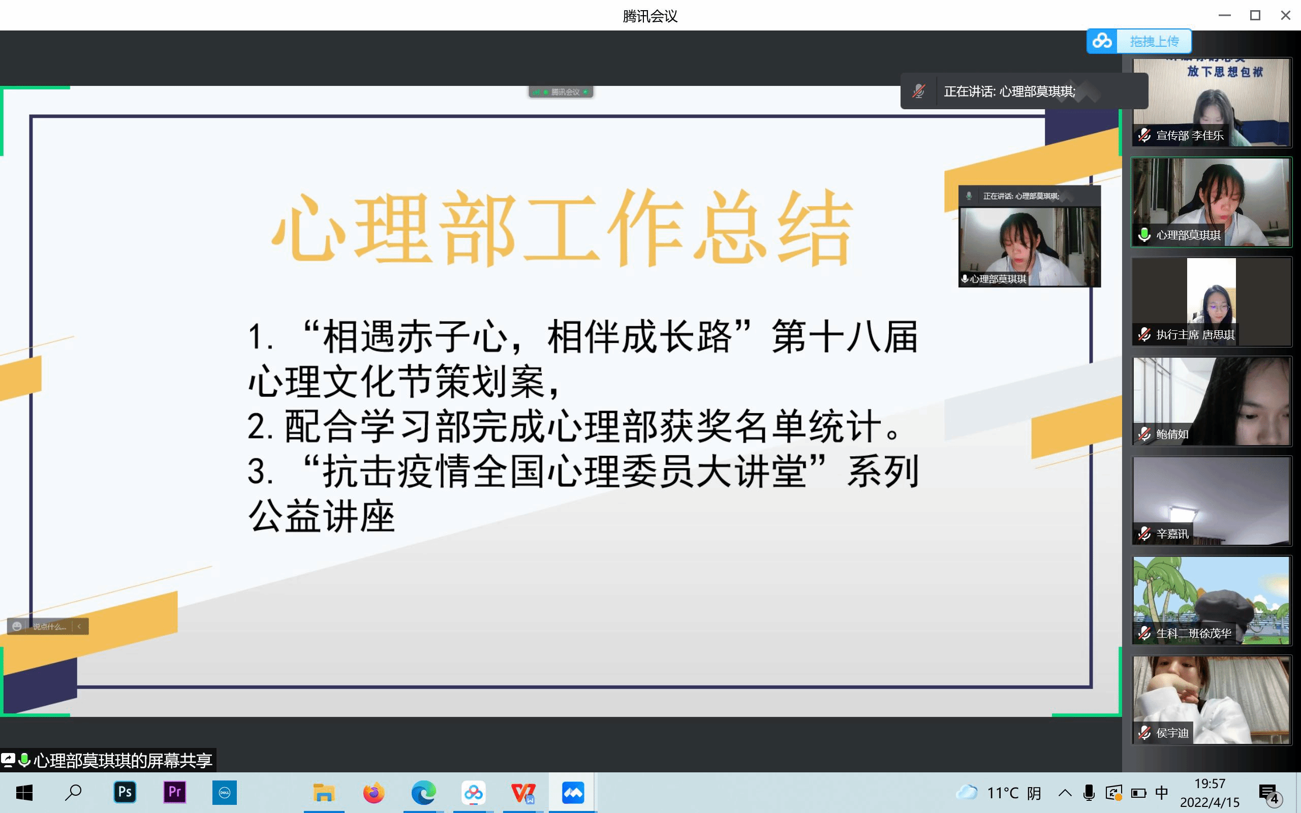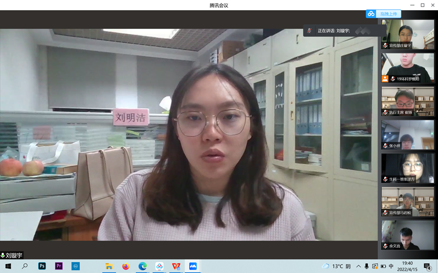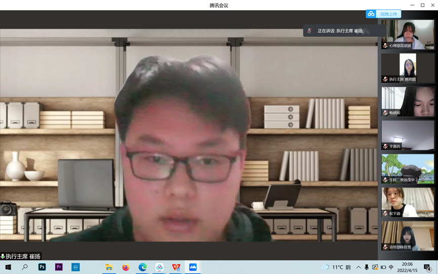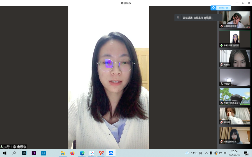 随后,执行主席唐思琪发言。她对分管的心理部与宣传部进行的工作做出总结并提出未来展望。她强调部门工作要发挥自身特色,做好同学们居家学习的心理监督及疏导作用以及通过宣传媒介做好大家的思想引导工作。她还希望同学们能够调整心态,反思沉淀,充分利用好居家学习的时间。