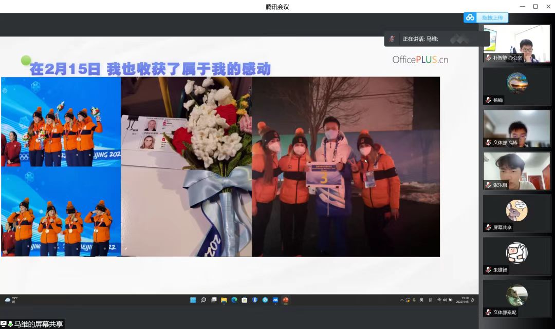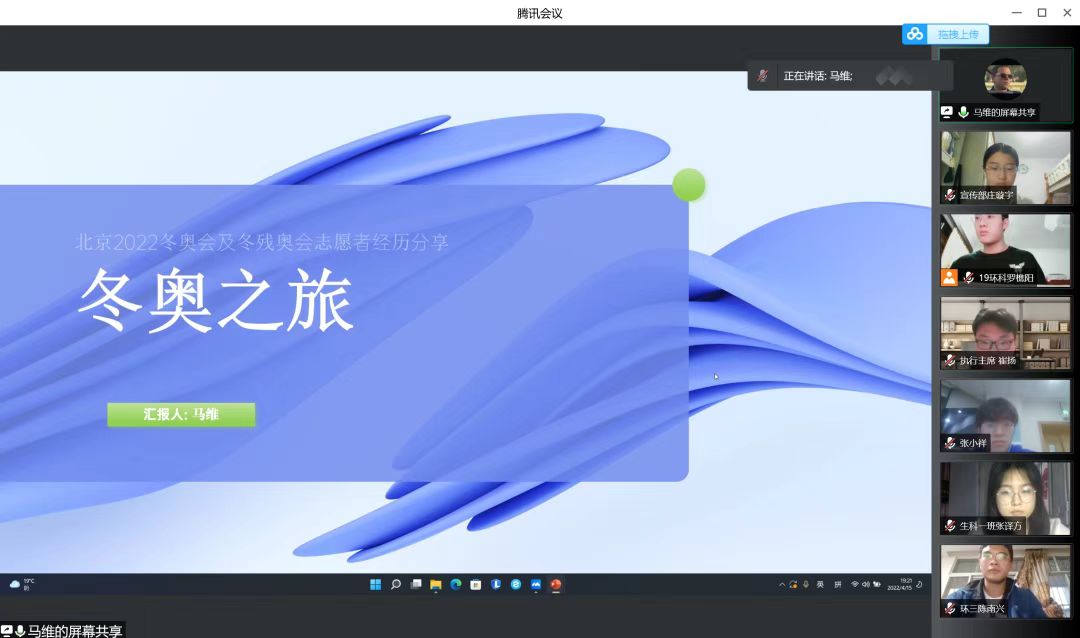 马维同学向大家分享自己的冬奥故事。首先,马维围绕志愿者的准备阶段向大家讲述了自己从选拔到培训再到实地演练的经历。在冬奥志愿期间,他作为获奖运动员交通陪同官员,主要负责将获奖运动员安全舒适地送抵颁奖广场候场室并将他们顺利送回冬奥村。此外,他表示在冬奥颁奖广场现场,他还会与不同的顶尖运动员们交流相处,他们不怕困难,勇于奉献的精神深深打动着他。最后,马维同学向大家分享了自己收获的回忆和对未来的展望。他表示此次志愿经历是锻炼自己和成长自己的绝佳机会,与不同的人接触的同时也刷新了对自己的认识。冬奥会和冬残奥会让他看到了精彩,看到了世界,他希望大家通过他的分享能够领悟冬奥精神,坚信自己能创造属于自己的精彩!