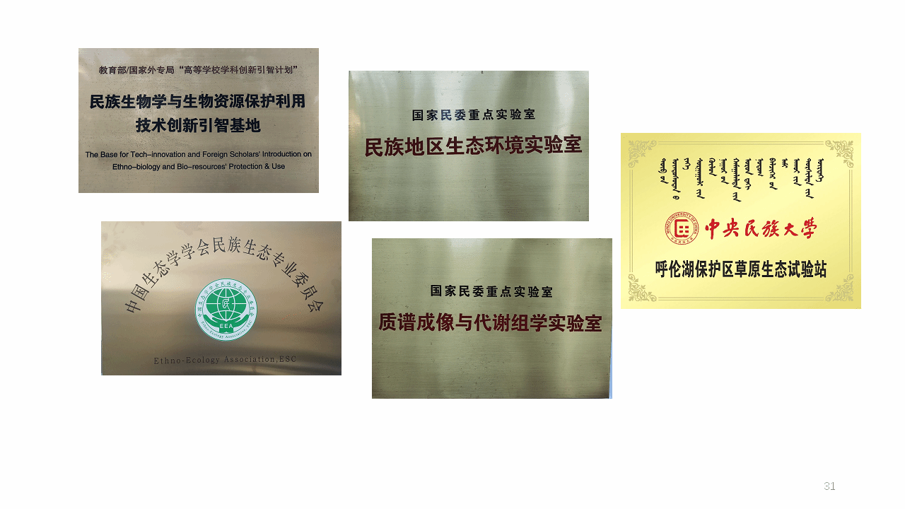 具有民族生物学与生物资源利用技术高校创新引智基地,民族地区生态环境国家民委重点实验室,质谱成像与代谢组学国家民委重点实验室,教育部民族医药重点实验室,建立了中央民族大学呼伦湖保护区草原生态试验站。创立了中国生态学学会民族生态专业委员会。为科学研究和人才培养提供了条件平台。