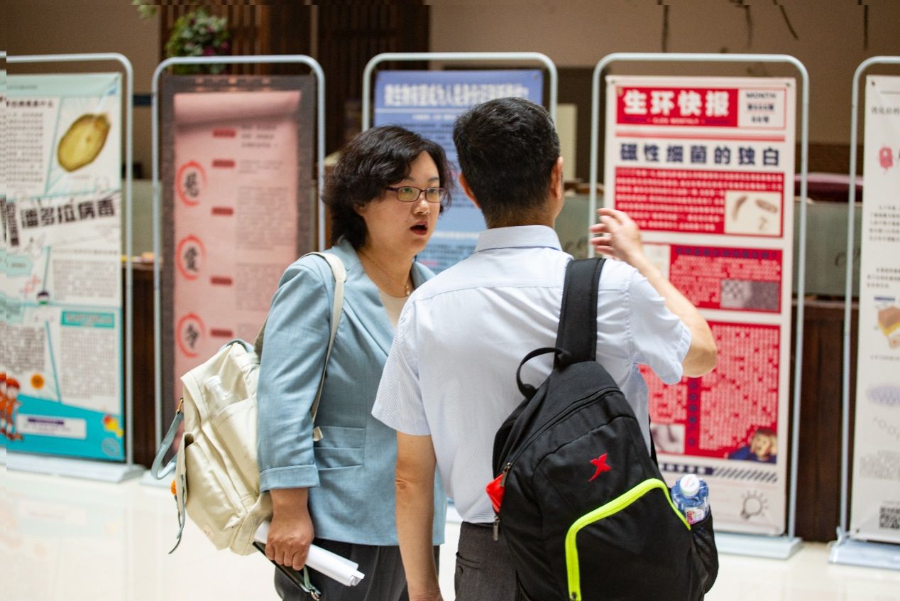 讲座后,陈向东教授前往理工楼大厅看了“微生物学课程研究性学习成果展”。