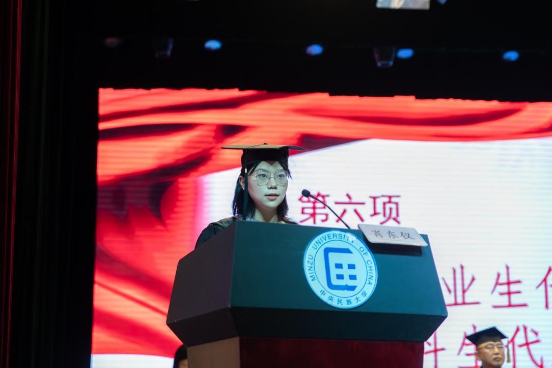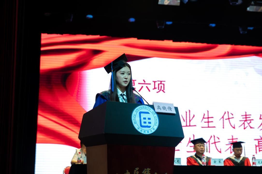 硕士毕业生代表高晓倩同学首先向全体老师的付出表达了真挚的感谢。回首三年学生时光,她表示,与民大相遇是一段珍贵而又美好的缘分。同时也强调,同学们的未来发展要以小我融入大我,将蓬勃青春与祖国发展融入一起。最后她祝愿生环AG娱乐城