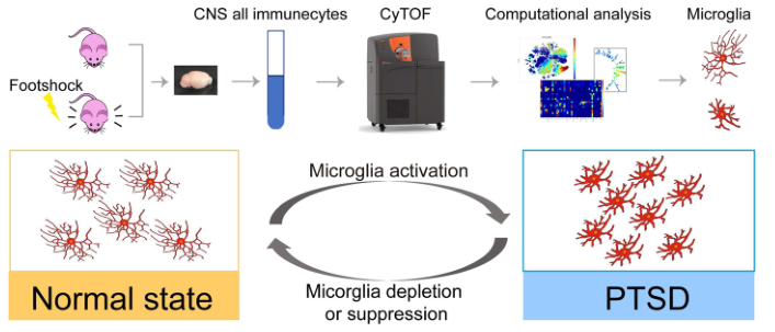 创伤后应激障碍(Post Traumatic Stress Disorder, PTSD)是创伤及应激相关的精神障碍疾病,临床症状严重、常引起焦虑、抑郁、认知能力下降,甚至出现自杀倾向。目前PTSD的致病机制尚不清楚,更缺乏有效的干预手段。该课题组前期研究发现NLRP3炎症小体激活参与PTSD的发生发展,提示神经炎症参与了PTSD的发生过程(Journal of Neuroinflammation,2020)。本项研究利用质谱流式技术发现PTSD可显著改变脑内的免疫稳态,其中小胶质细胞的变化最为明显;利用基因操作以及药物化学干预的方式,证明小胶质细胞在PTSD的发生发展过程中发挥重要作用;进一步研究发现临床药物米诺环素(Minomycin)可有效抑制脑内小胶质细胞的激活,显著改善PTSD中恐惧、焦虑等相关行为(图1)。本项研究成果丰富了对PTSD致病机制的认识,为目前尚未攻克的PTSD的预防和治疗提供了全新的干预靶点和策略。