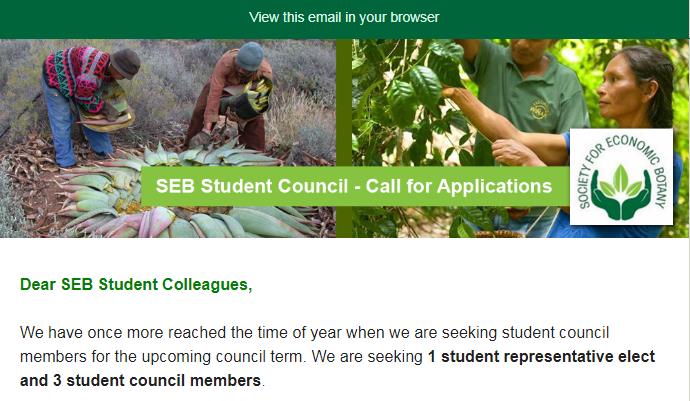 学生委员会(Student Council/Committee)是国际经济植物学会设立的16个委员会中最活跃的分支机构之一,设6名委员(Committee Member),任期两年。学生委员会委员从SEB正式会员中遴选,候选人必须是对民族植物学、民族生态学、经济植物学或相关领域感兴趣且有较强组织协调能力的本科生或研究生。SEB学生委员会旨在通过学生网络,举办符合学生兴趣和特点的活动,促进民族植物学、经济植物学及相关领域的教育和科学研究,以及为对这些领域感兴趣的同学提供信息和交流的机会。