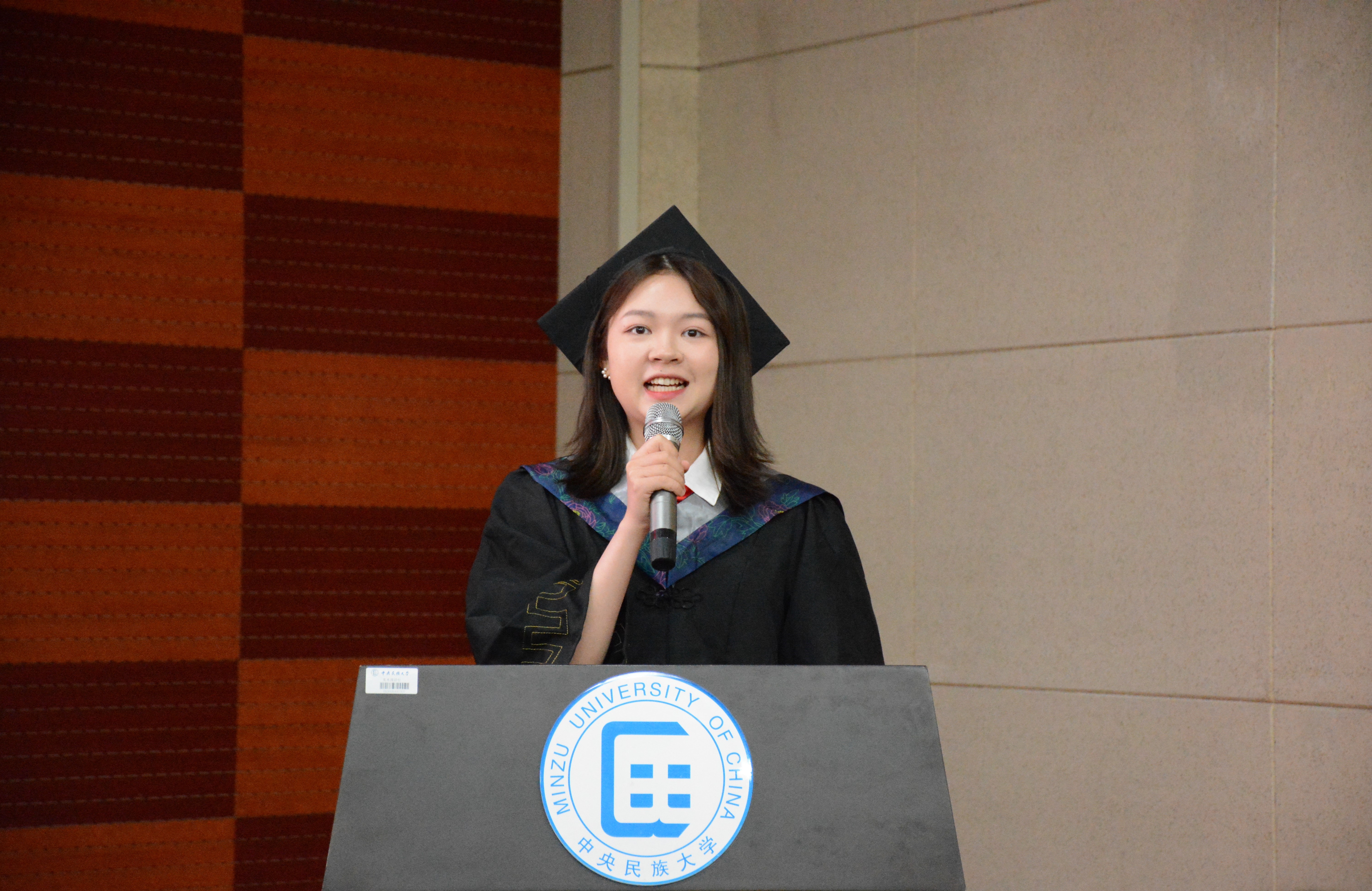 本科生毕业生代表赵悦汝同学及研究生毕业生代表程卓同学分别发言。他们向关爱学子、诲人不倦,给予殷切教导的师长表达出衷心的感激之情;回顾了校园生活的点点滴滴,讲述了各自在民大、在生环AG娱乐城