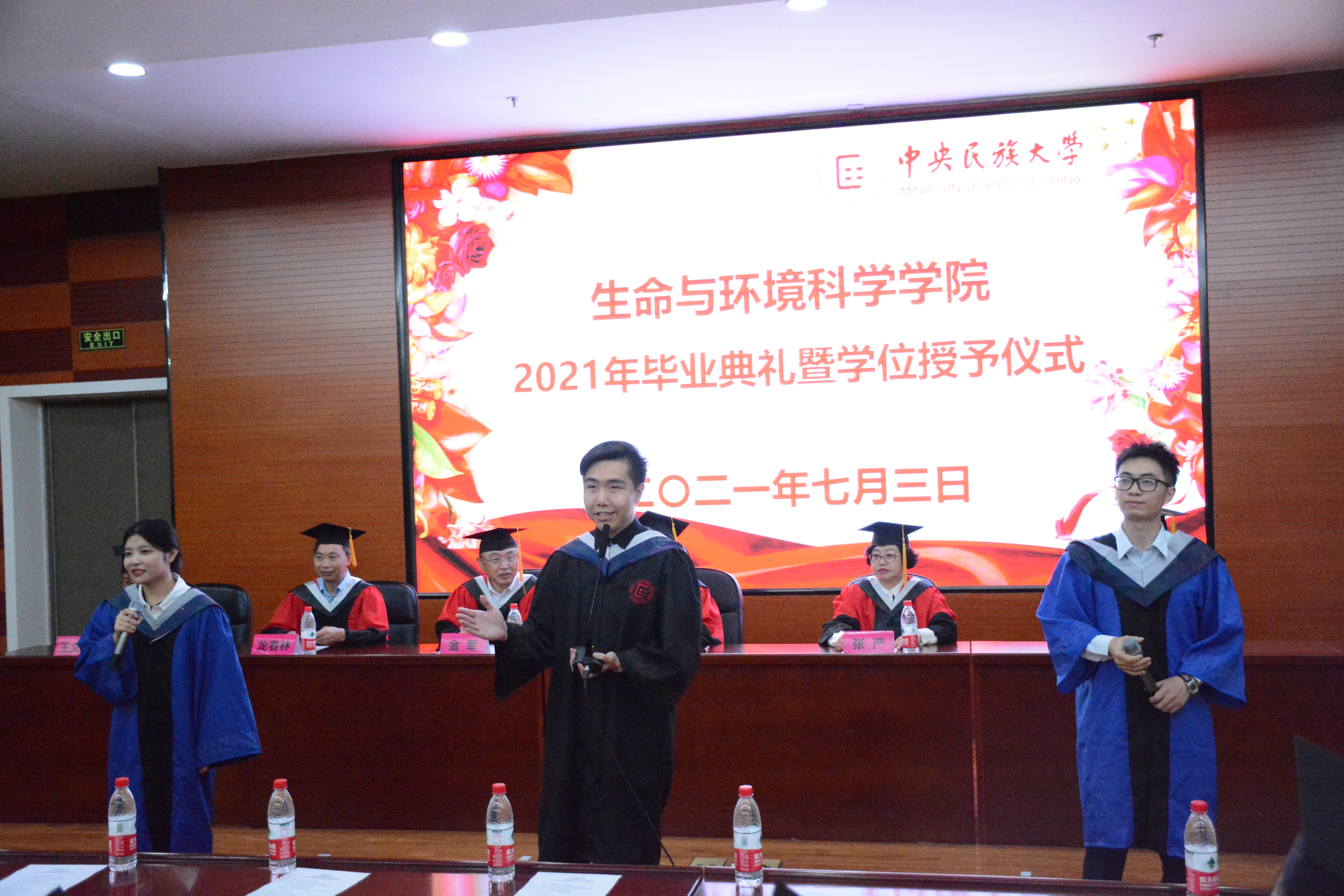几年来的成长历程。寥寥数语,饱含着经自身实践而得到的颇多感悟,亦不乏对校门外生活的憧憬与向往。最后,两位毕业生代表向全体毕业生送上了诚挚的祝福,“愿大家佩戴着民大生环人的标签,奔赴五湖四海,绽放绚丽之花” “带着美美与共、知行合一的校训,以及青春如火、超越自我的生环精神,在新的岗位,建功立业”。