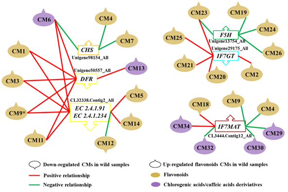 图2. 24个品种相关化学标志物与6个差异表达基因相关性网络