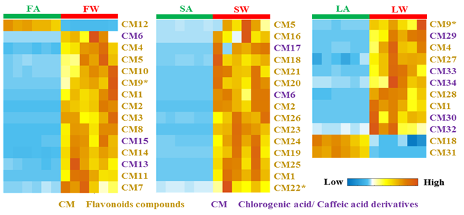 图1.人工栽培和野生品种的新疆一枝蒿花、茎、枝叶中34个品种相关化学标志物