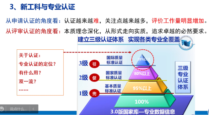 唐晓龙教授向与会老师详细介绍了专业认证的发展历程、一流专业建设的申请原则、专业认证对于新工科建设的意义、认证材料的撰写和现场考察内容等5个方面。唐晓龙教授分别从裁判员(工程认证评估专家)和运动员(工程认证申请人)2个层面详细阐述了工程认证申请各个环节需要注意的问题,分享了申请工程专业认证的经验。