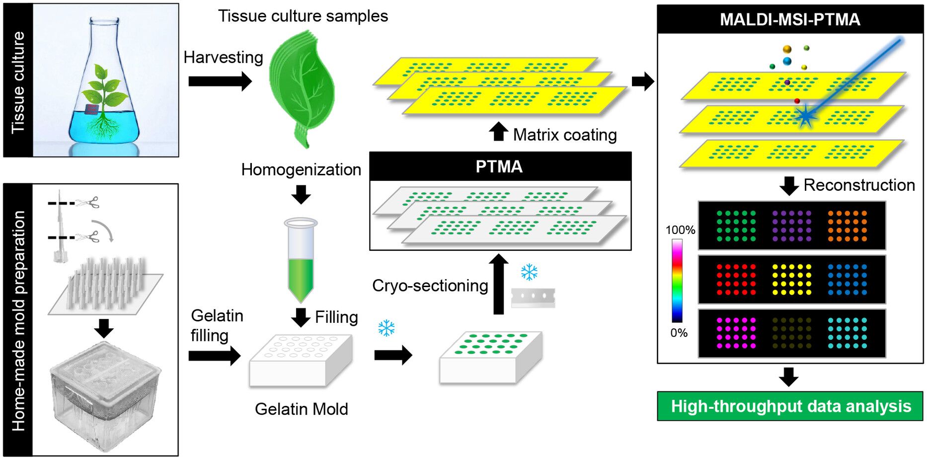 研究团队利用明胶分子成功制备了植物组织微阵列模具 (PTMA)。将选取的植物组织样本进行充分匀浆处理后即可获得包含植物组织内部全部代谢分子匀浆液;随后在低温条件下立即将组织匀浆液小心注入PTMA明胶模具中并放置于冷冻切片机内冷却,待其充分冷冻凝固后即可进行高质量冰冻切片;将植物组织微阵列切片融裱至ITO导电玻片上,待其干燥后利用基质喷涂装置进行基质包被,随后利用MALDI-MS仪即可进行植物组织代谢分子质谱高效检测与成像分析。