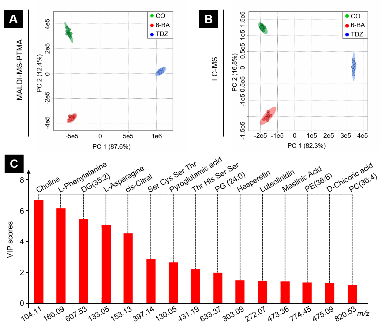 最后,团队研究人员利用MALDI-MSI-PTMA技术成功地快速评价了两种植物生长调节剂处理 (6-BA和TDZ) 对组织培养获得的岩青兰样本内源性代谢分子表达的影响,并将其结果与LC-MS获取的代谢物检测结果进行了比较评价。比较统计学分析结果可以发现:MALDI-MSI-PTMA和LC-MS检测效能具有高度一致性,表明MALDI-MSI-PTMA一定程度上可以媲美LC-MS代谢分子检测效果。然而需要特别指出的是:LC-MS完成一个样本检测所消耗的时间大致为15-30 min,且需要较为复杂的样本前处理过程;相比之下,MALDI-MSI-PTMA技术在激光扫描步长为150和300 µm时,分别仅需1.2和0.6 min即可完成对一个样本点 (直径为1.0 mm) 的检测,因此利用该技术在不间断的情况下每天即可完成1200-2400个样本的高质量检测。在此条件下,MALDI-MSI-PTMA的检测效率较LC-MS提高了12.5 ~ 50倍,因此也充分表明MALDI-MSI-PTMA技术具有高通量快速检测的优势。除此之外,利用MALDI-MSI-PTMA技术不仅可以实现植物样本代谢分子高通量检测,而且可以根据不同需求调整植物样本阵列点的尺寸,极大方便了多元实验设计需求。团队研究人员还基于MALD-MSI-PTMA的可视化能力成功对15种重要差异代谢分子 (VIP>1) 进行了质谱成像可视化表征,清楚展示了这些分子在三种不同处理组岩青兰叶子中存在明显表达差异,这对于植物精准组培技术的进一步发展具有重要现实意义。