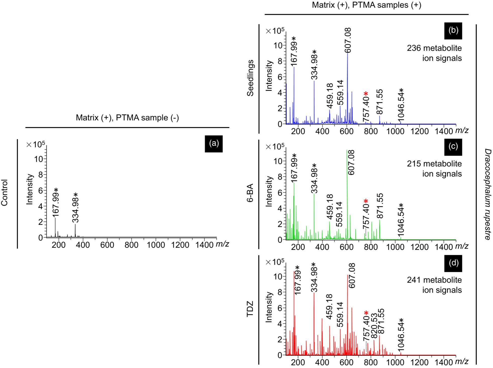 不同处理岩青兰叶片PTMA代谢分子MALDI-MS检测效能比较