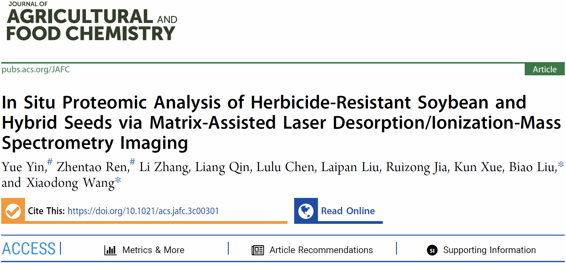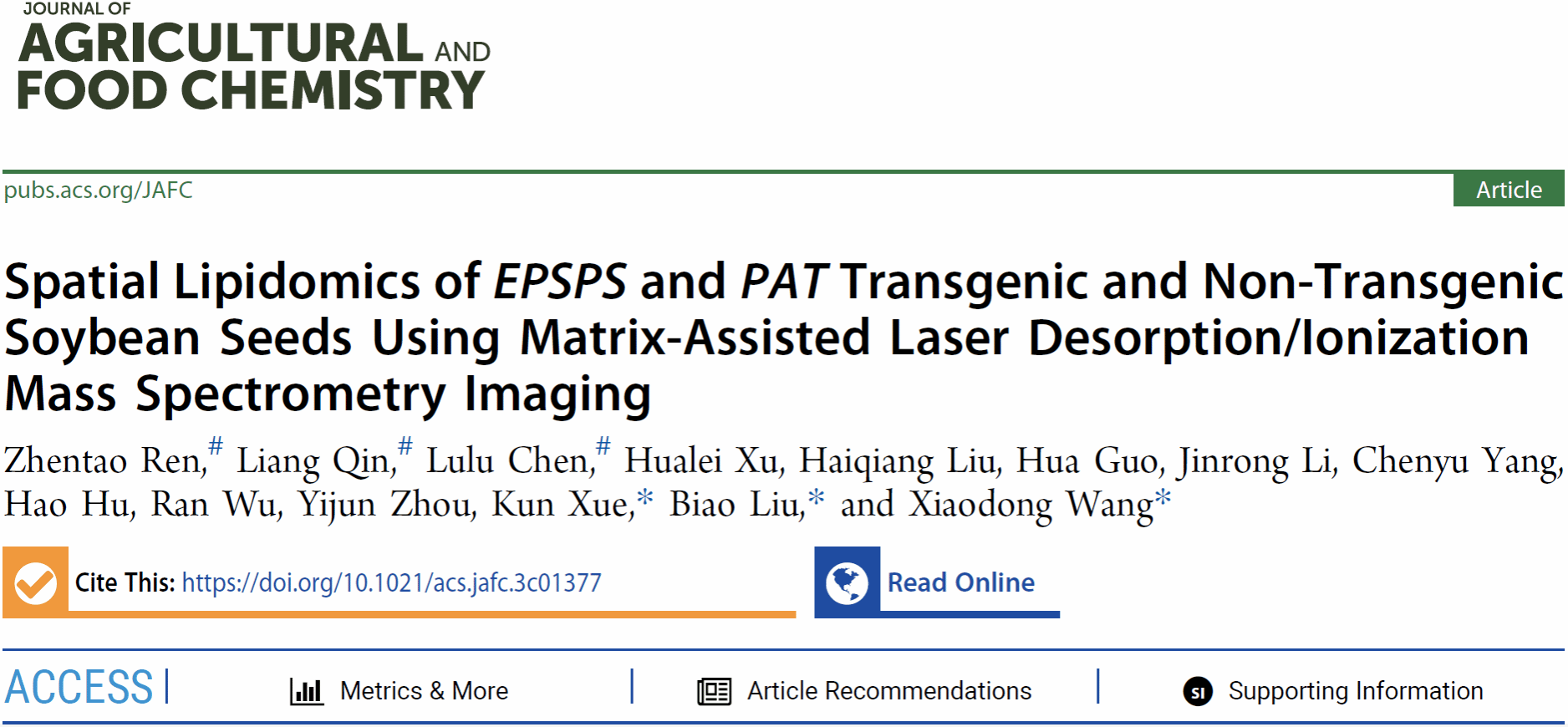 /质谱成像与代谢组学国家民委重点实验室的王晓东教授和薛堃副教授团队,在MALDI源质谱成像新应用领域方面——以MALDI-MSI技术评估转基因大豆脂质组和蛋白质组的非预期效应连续取得两项重要进展,相关研究成果以“Spatial lipidomics of EPSPS and PAT transgenic and non-transgenic soybean seeds using matrix-assisted laser desorption/ionization mass spectrometry imaging” “In situ proteomic analysis of herbicide-resistant soybean and hybrid seeds via matrix-assisted laser desorption/ionization-mass spectrometry imaging”为题,连续发表在农林科学综合权威期刊Journal of Agricultural and Food Chemistry(中国科AG娱乐城