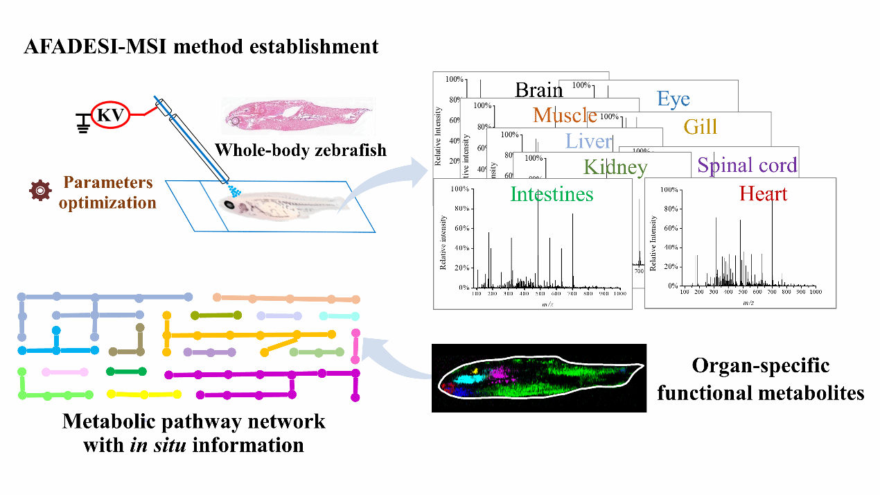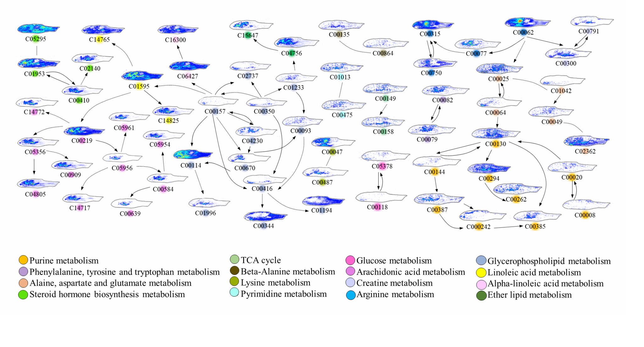 斑马鱼是研究人类疾病的优良材料,尤其在精准肿瘤学动物模型构建领域具有独特优势与前景。由于人类肿瘤多发生于成人期,大多数已报道的基于斑马鱼模型的肿瘤研究采用胚胎或幼鱼,无法真实模拟肿瘤的体内启动过程。本研究采用新型敞开式质谱成像技术AFADESI-MSI,通过系统优化关键参数,建立了适合于斑马鱼成鱼冰冻组织切片的空间分辨代谢组学分析新方法。该方法覆盖度良好、灵敏度高,可检测到1000余个不同的代谢物;通过提取眼、脑、鳃、心、肝、肾、肠、肌肉、脊髓等9个器官区域的质谱成像数据,获得了不同器官特征代谢组及其特异性代谢物。在此基础上,构建了包含代谢物原位信息的斑马鱼全局代谢网络。本研究在代谢水平上提供了斑马鱼成鱼全面而直观的分子信息,为基于斑马鱼模型的疾病代谢重编程研究提供了新的技术手段。