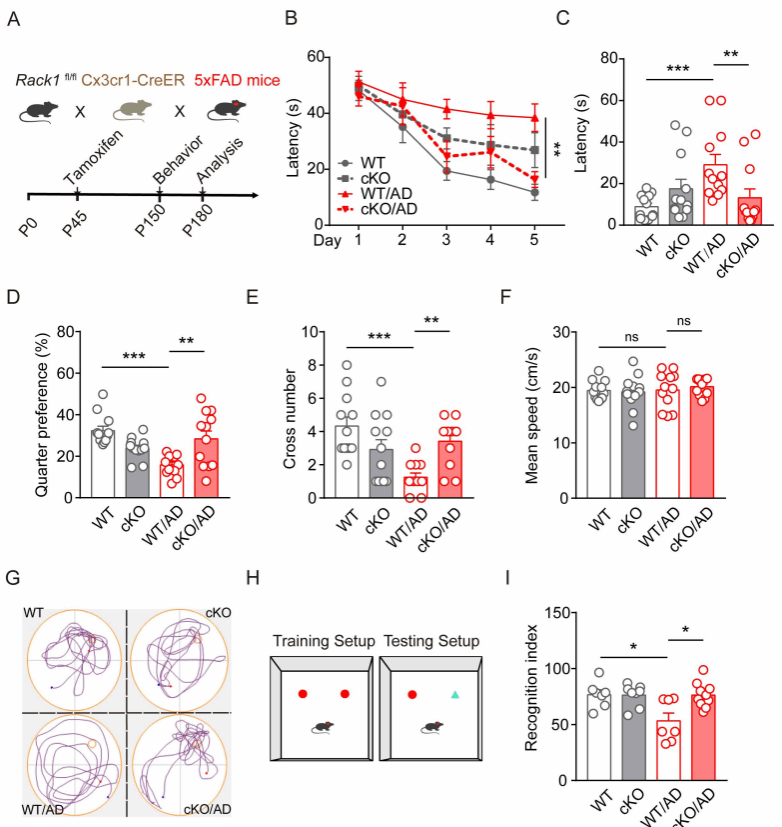 图1:敲除小胶质细胞Rack1改善AD模型小鼠的认知损伤
